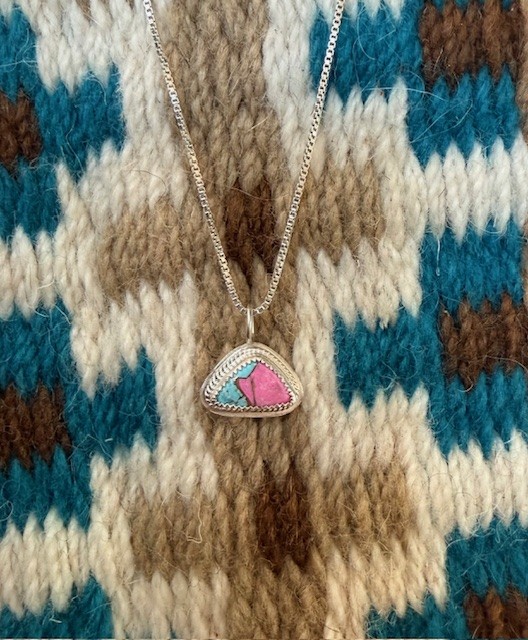 This striking handcrafted pendant features a vibrant stone displaying beautiful shades of pink and turquoise, set in sterling silver. The unique color contrast gives the piece a bold yet elegant look that captures the spirit of contemporary western jewelry design.