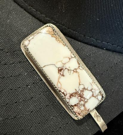 Bold and unmistakably Western, this handcrafted piece features a striking White Buffalo stone set in sterling silver. The creamy white stone with natural matrix patterns gives each piece a rugged, one-of-a-kind character—perfect for those who like their style with a little edge.